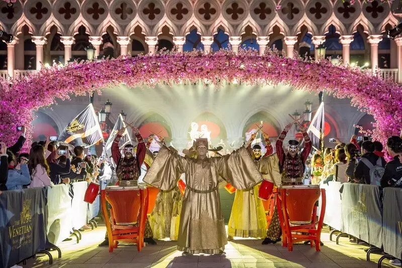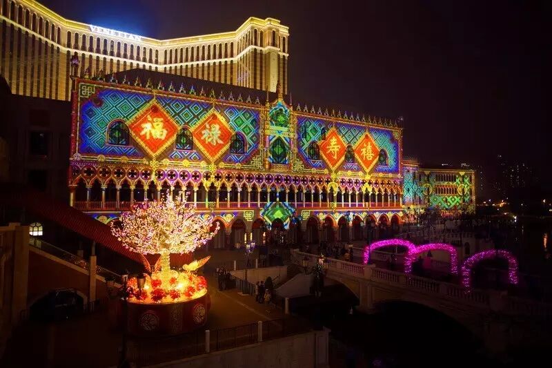 而澳門威尼斯人戶外人工湖畔區及澳門巴黎人的巴黎鐵塔和酒店門廊均掛上燈籠、賀年鮮花、樹燈及扇子等一系列色彩繽紛的賀年裝飾,充滿節日氣息。