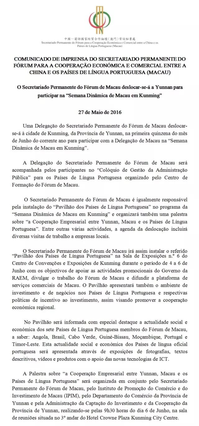 中葡論壇(澳門)常設秘書處將於本年六月上旬隨澳門代表團赴雲南省昆明市參與「活力澳門推廣週•雲南昆明」各項主要活動,包括設置葡語國家館、舉辦「雲南-澳門-葡語國家企業合作座談會」及參訪企業等商務活動。屆時由中葡論壇(澳門)培訓中心主辦的「葡語國家公共行政管理研修班」學員也將隨團赴昆明市參加相關活動。