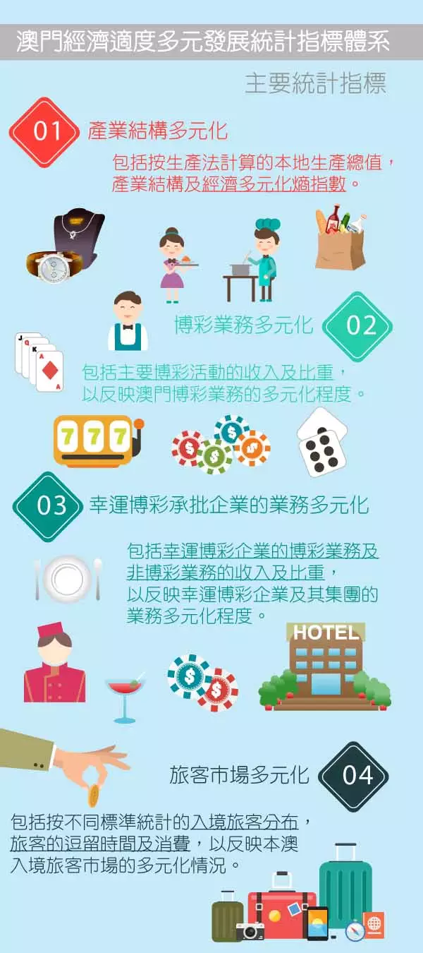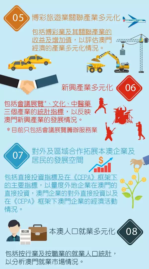 為更好反映澳門經濟多元發展的情況,統計暨普查局按照特區政府施政方針,在2015年開始了《澳門經濟適度多元發展統計指標體系》的構建工作。